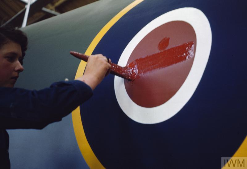 BUILDING MOSQUITO AIRCRAFT AT THE DE HAVILLAND FACTORY IN HATFIELD, HERTFORDSHIRE, 1943 (TR 918) Painting the roundel on the side of a Mosquito at the factory. Copyright: © IWM. Original Source: http://www.iwm.org.uk/collections/item/object/205188556